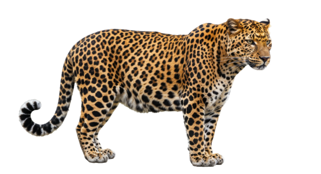 Magnificent leopard standing in an alert posture, its beautifully spotted coat gleaming, tail characteristically curled, and ears pricked forward. Full body isolated.