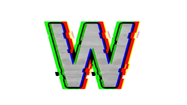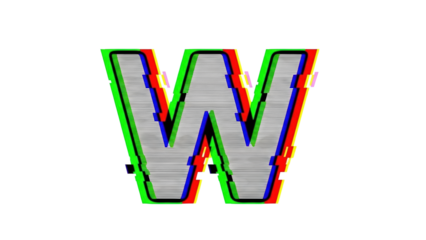 Glitch VHS letter W with noisy glitch haze and drifting chromatic edges on white background