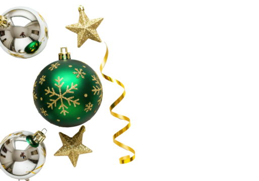A flat lay of matte emerald green & glossy silver Christmas baubles with gold caps, glittery stars, iridescent ribbon on a transparent background with copy space, elegant festive design