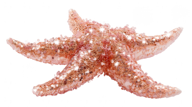 A glittery pink starfish is isolated against a bright white background shimme with tiny golden particles.