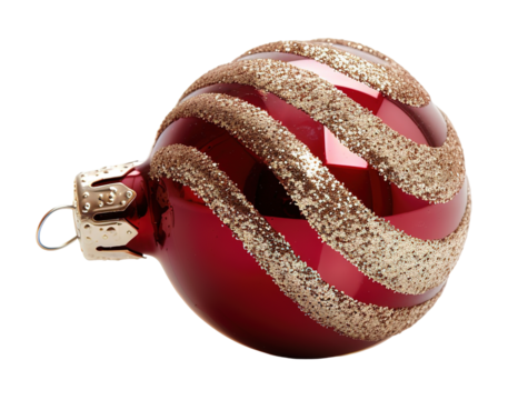 A festive Christmas ornament ball in vibrant red and gold shines brightly. This decorative piece features glittery stripes and is perfect for holiday celebrations and tree decorations