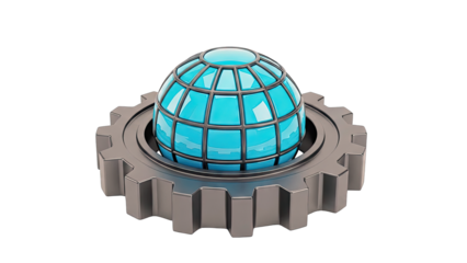 Globe with magnifying glass and gear isolated PNG on transparent background, global search and business process concept