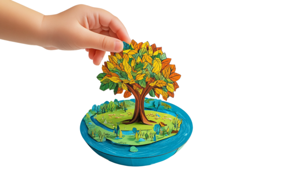 Childs hand gently placing a paper globe cutout symbolizing hope, future generations, and global environmental responsibility isolated on transparent background PNG