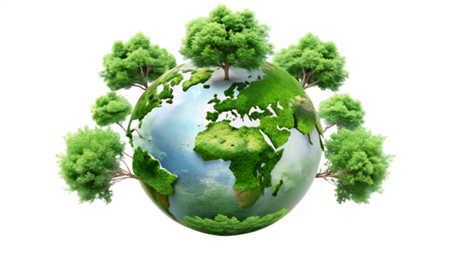 Planet earth with trees growing on it, symbolizing nature and environment, isolated on transparent background