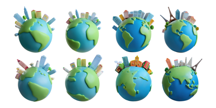 Colorful Globe Representations with Buildings, PNG collection, set bundle, isolate on transparent or white background