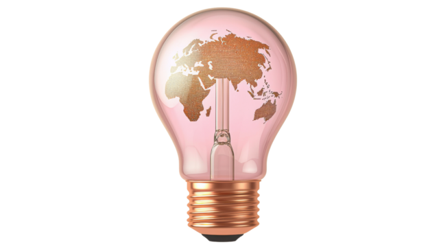 Conceptual image of a lightbulb with a world map inside, symbolizing global innovation and ideas.