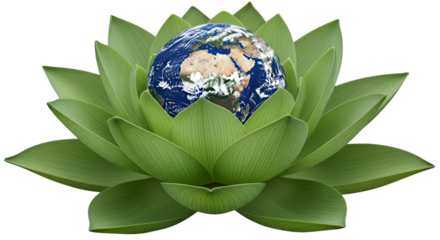PNG of Earth sitting inside a green lotus flower, sharp, white background.