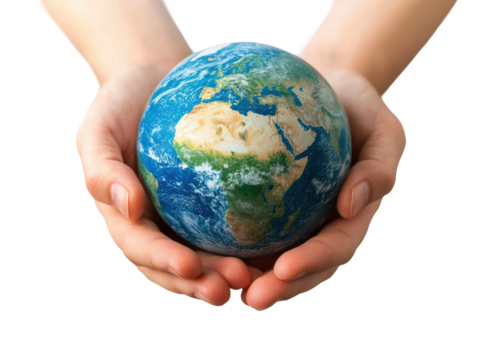 Hands gently holding a detailed miniature globe with continents and oceans visible, symbolizing care, global connection, and planet Earth isolated on transparent background
