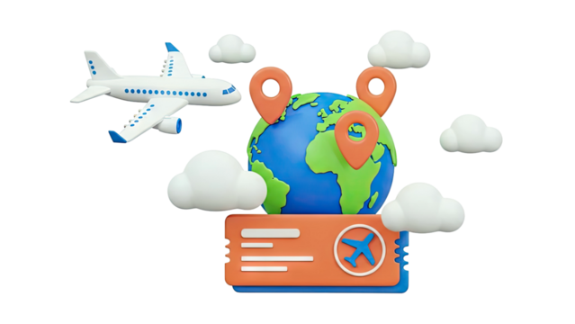 3D Travel Icons: Airplane, World Map, Location Pin, and Clouds