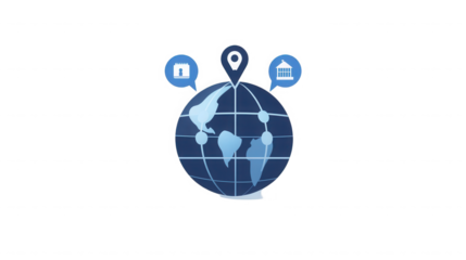 Globe with location pin calendar and bank icons representing global events on transparent background