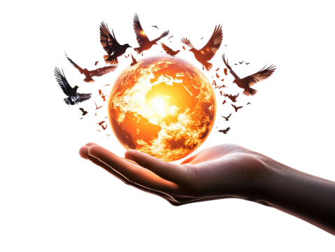 Peace day concept with hands gently holding a white dove over earth, symbol of unity and hope.