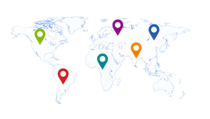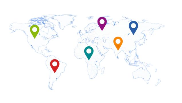 Global network map showcasing multiple location markers across continents, illustrating worldwide reach or connections.