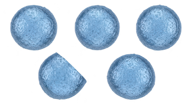Rendered blue water spheres in different angles showcasing textures against a white background for science visuals
