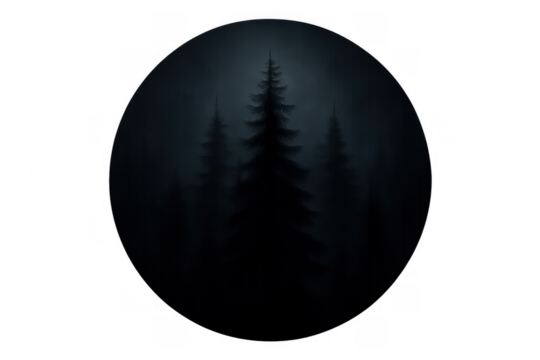 Dark forest with fir trees forming a mysterious, spooky landscape shrouded in thick fog, transparent background