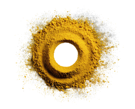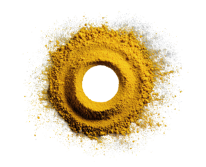 Circular arrangement of orange-brown powder with a dark hole in the center, surrounded by a halo of the same powder
