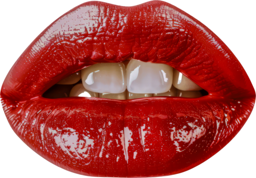 Isolated lips in bright red gloss color with teeth showing, healthy smile concept art