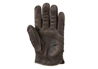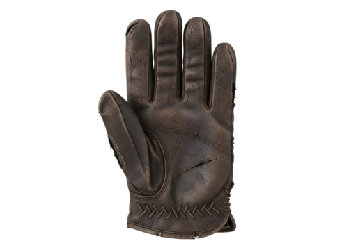 A close-up view of a worn leather glove with a rich brown tone against a black background.