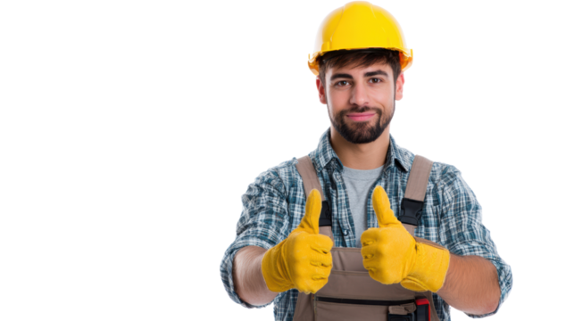Worker with yellow hard hat and gloves, showing thumbs up, isolated on white background.