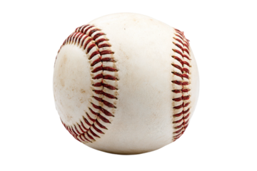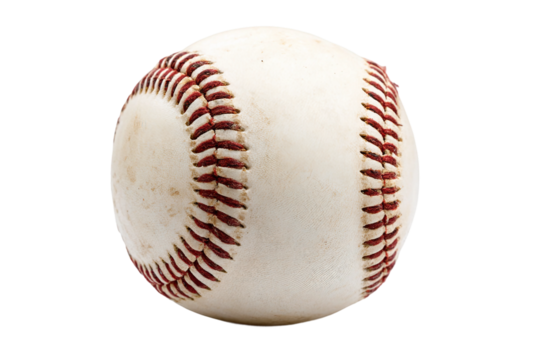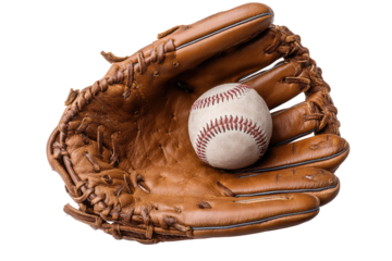 Baseball glove holding a ball.  A vintage, tan leather baseball mitt cradles a classic white baseball with red stitching.  Image is isolated on black background