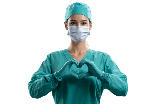 Female nurse in scrubs and a mask showing a heart symbol with gloved hands, isolated on transparent background