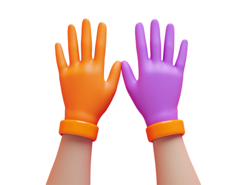 Two gloved hands, 3d render ,vibrant orange and purple gloves with orange cuffs, symbolizing collaboration and safety, isolated on transparent background, cut out, close up, high quality, PNG file.