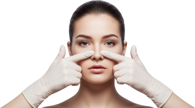 Transparent portrait of woman with gloves prepping face for botox