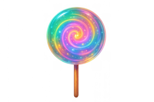 Lollipop with glowing rainbow swirl, magical galaxy effect, vibrant sweet candy icon, transparent background
