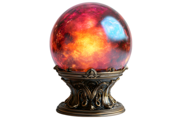 Glowing crystal ball on ornate metallic stand mystical object for fortune telling isolated on white background
