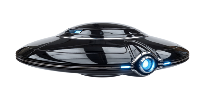 Flying saucer ufo spaceship with bright underlights, symbolizing extraterrestrial life, exploration, and advanced technology. Transparent background