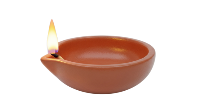Ornate terracotta diya lamp glowing bright flame isolated on a transparent background light
