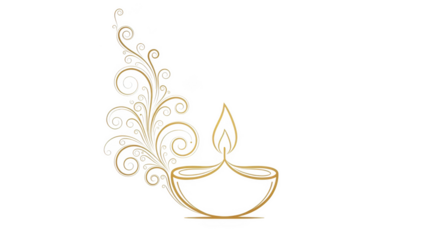 Golden diya oil lamp with ornate floral swirl decoration isolated on a transparent background light flame