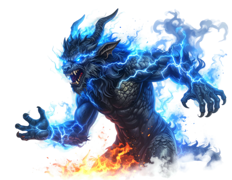 A fierce blue creature with glowing eyes and horns, wreathed in electric energy, rising from flames, ready to strike