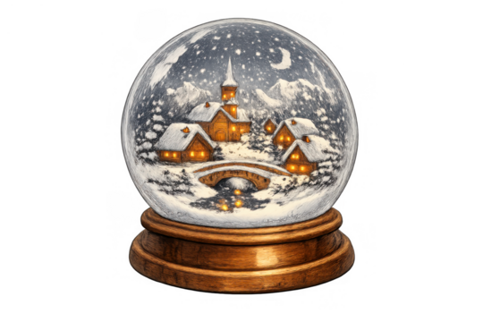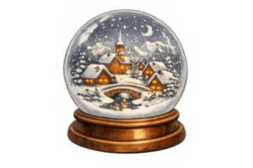 Snow globe creating a cozy winter village scene with falling snow, glowing houses, church, and bridge, transparent background