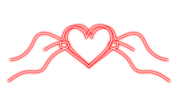 Two hands forming a heart shape with glowing red neon on transparent background