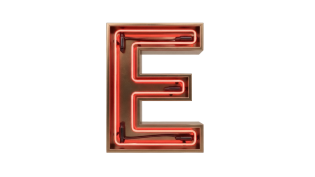 Red illuminated letter E neon sign isolated on a transparent background