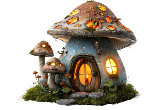 Whimsical mushroom house with glowing windows and detailed textures, surrounded by smaller mushrooms in a magical, fairy-tale setting.