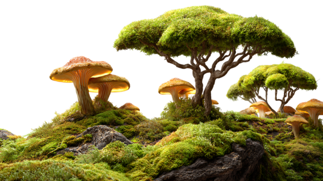 Enchanting forest scene with glowing mushrooms and mosscovered hills isolated on transparent background