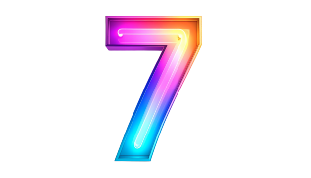 A vibrant, neon-style numeral "7" glows with rainbow hues against a stark black backdrop, creating a striking visual