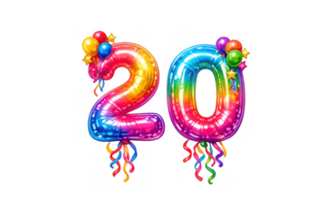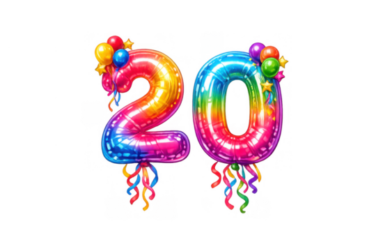 Twenty number balloons in rainbow colors for celebrating birthday, anniversary, or special event transparent background