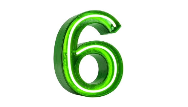 Illuminated, three-dimensional numeral six rendered in a vibrant green neon light against a stark black background