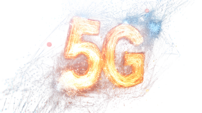 Glowing 5g network symbol in digital portal style on pure white background with orange and yellow gradient light effect