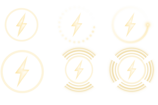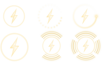 Futuristic yellow glowing wireless charging icons pack featuring power bolt shapes, induction waves, and bright neon rings for smartphone UI components, energy status panels, and tech vector graphics