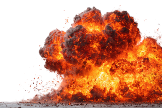 A powerful, bright orange and red explosion with dark smoke and flying debris, isolated against a transparent background, capturing intense energy and destruction. background removed