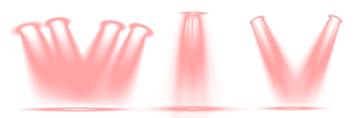 PNG set of glowing red spotlights. Bright luminous beams and shining rays create a dramatic stage atmosphere. Abstract glowing illumination ideal for concerts, shows, or visual design projects.