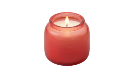 Glowing red glass jar scented candle burns gently with a warm bright flame on transparent background