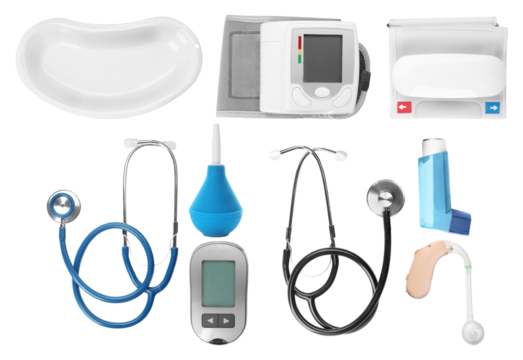 comprehensive medical equipment flat lay, featuring stethoscopes, blood pressure monitor, glucometer, ear mold, and asthma inhaler on a transparent background.