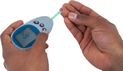 Person checking blood sugar level with glucose meter isolated on transparent background for healthcare and medical use