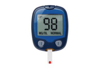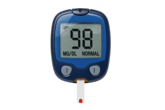 Blood glucose meter displaying normal reading isolated on transparent background
