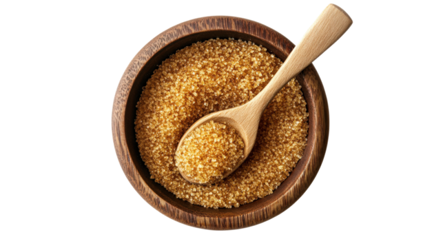 Sweet brown sugar. natural sweetener. wooden bowl and spoon.