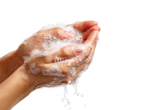 Woman washing hands with soap and water bubbles, Isolated On White Background, Png Transparent